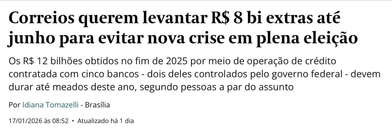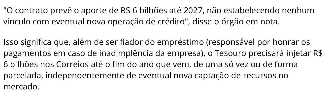 Nessa história dos Correios, cada enxadada é uma minhoca. Agora ficamos sabendo que, no contrato do empréstimo de R$ 12 bilhões com o consórcio de bancos, há uma cláusula de capitalização de R$ 6 bilhões por parte do governo. Assim, além dos R$ 8 bilhões adicionais que os Correios necessitam para fechar as contas desse ano, o governo vai precisar aportar, até o fim de 2027, R$ 6 bilhões dos meus, dos seus, dos nossos impostos.